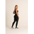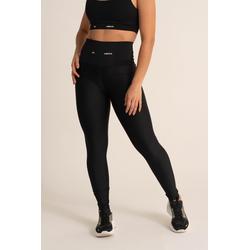 Leggings deportivos de mujer en color negro, hechos de lycra elástica que se adapta a diferentes tipos de cuerpo, con una pretina de control abdominal y tecnología de compresión para mayor soporte en el abdomen. Fabricados con telas inteligentes de alta densidad y suaves para brindar comodidad durante el ejercicio y evitar transparencias incómodas al hacer sentadillas o flexiones. Perfectos para combinar con cualquiera de nuestros bras.