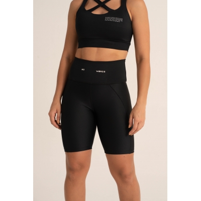 Modelo Biker deportivo de mujer en color NEGRO, hechos de lycra elástica que se adapta a diferentes tipos de cuerpo, con una pretina con control de abdomen y tecnología de compresión para mayor soporte abdominal. Fabricados con telas inteligentes de alta densidad y suaves para brindar comodidad durante el ejercicio y evitar transparencias incómodas al hacer sentadillas o flexiones. Ideales para combinar con nuestros Bra.