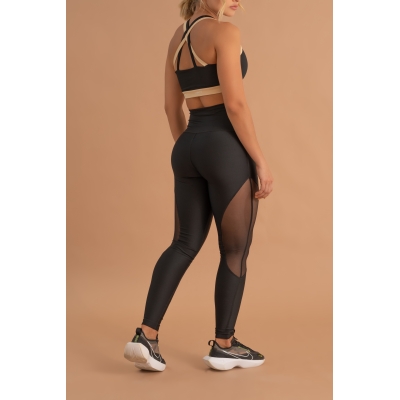 Leggings deportivos de mujer en color negro y mesh, hechos de lycra elástica que se adapta a diferentes tipos de cuerpo, con una pretina de control abdominal y tecnología de compresión para mayor soporte en el abdomen. Fabricados con telas inteligentes, suaves y de alta densidad para brindar comodidad durante el ejercicio y evitar transparencias incómodas al hacer sentadillas o flexiones. Ideales para combinar con cualquiera de nuestros bras.