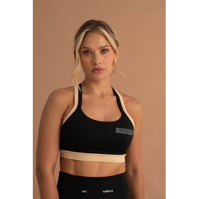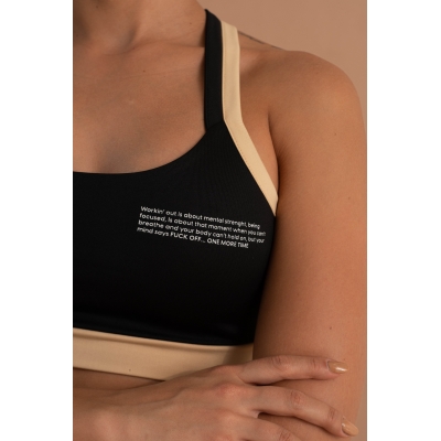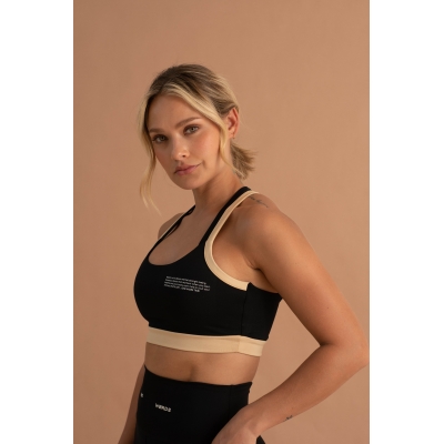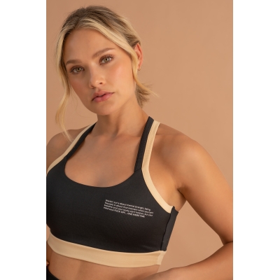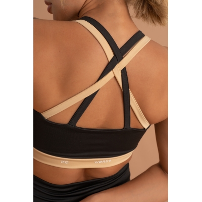 Top deportivo de mujer en color negro y nude, hecho de lycra elástica que se adapta a diferentes tipos de cuerpo, con escote en U y tirantes cruzados estilo canasta en la espalda. Diseñado con tecnología de compresión para un mejor ajuste. Fabricado con telas inteligentes de alta densidad y suaves para brindar comodidad durante el ejercicio y evitar transparencias incómodas