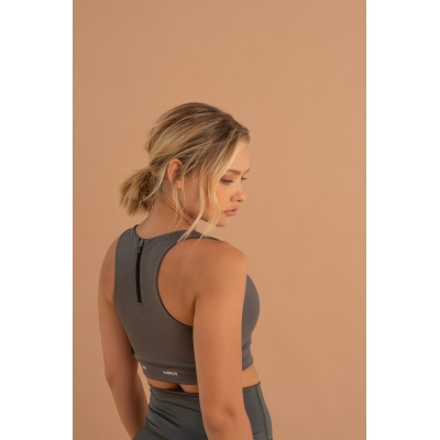 Top deportivo de mujer en color oliva, hecho de lycra elástica que se adapta a diferentes tipos de cuerpo, con escote en U y espalda cerrada con cremallera. Diseñado con tecnología de compresión para un mejor ajuste. Fabricado con telas inteligentes de alta densidad y suaves para brindar comodidad durante el ejercicio y evitar transparencias incómodas al hacer sentadillas o flexiones. Ideal para combinar con cualquiera de nuestros leggings.